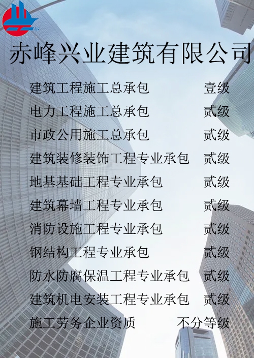 赤峰興業(yè)建筑有限公司簡介 赤峰興業(yè)建筑有限公司成立于1998年7月,位于內(nèi)蒙古赤峰市松山區(qū)。現(xiàn)已發(fā)展成為擁有建筑工程施工總承包壹級、電力工程施工總承包貳級、市政公用工程施工總承包貳級、承裝、修、試四級、?建筑裝修裝飾工程專業(yè)承包貳級、建筑幕墻工程專業(yè)承包貳級、消防設施工程專業(yè)承包貳級、地基基礎(chǔ)工程專業(yè)承包貳級、鋼結(jié)構(gòu)工程專業(yè)承包貳級、建筑機電工程專業(yè)承包二級、防水防腐保溫工程專業(yè)承包貳級以及建筑施工勞務等資質(zhì)的綜合性建筑施工企...